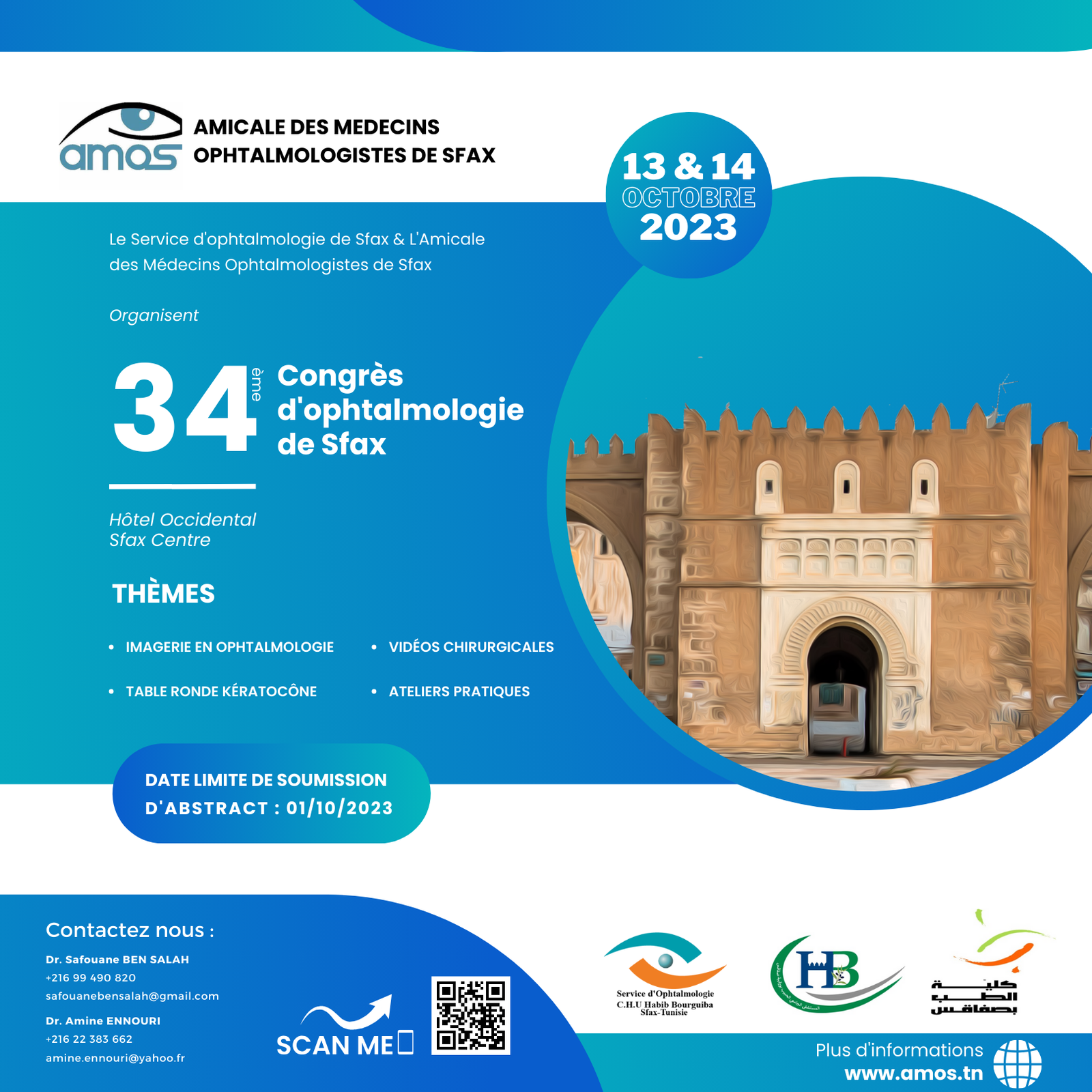 L’Amicale des Médecins Ophtalmologistes de Sfax a le plaisir et l’honneur de vous inviter à son 34 ème congrès d’ophtalmologie de Sfax qui se tiendra à l’Hôtel Occidental-Sfax Centre, les 13 et 14 Octobre 2023.