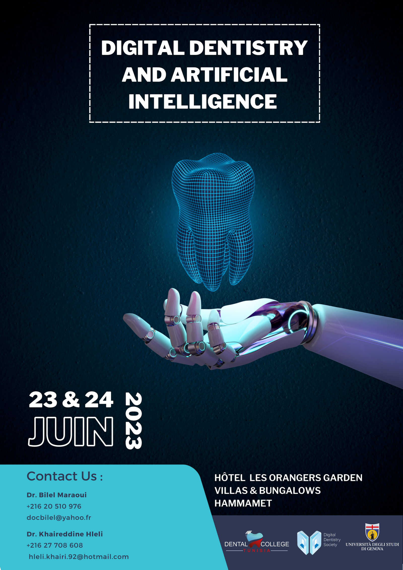 L’Association Dental College Tunisia a le plaisir et l’honneur de vous inviter à son congrès DIGITAL DENTISTRY AND ARTIFICIALINTELLIGENCE qui se tiendra à l’Hôtel Les Orangers Garden Villas & Bungalows-Hammamet, les 23 et 24 Juin 2023.